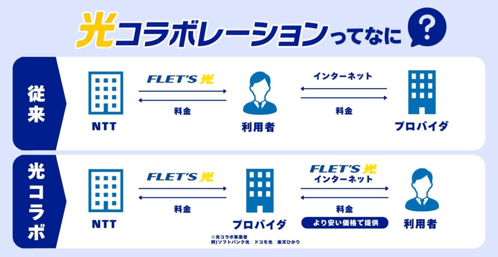 光コラボレーション(光コラボ)とは、NTT東西が提供する光回線のインフラを、様々な事業者が借り受けて独自のサービスと組み合わせて提供する仕組みです。